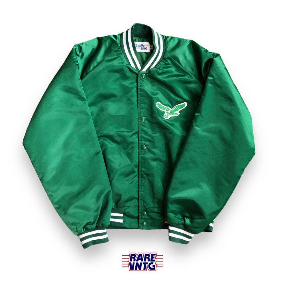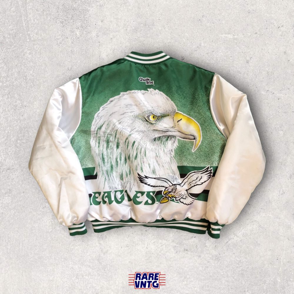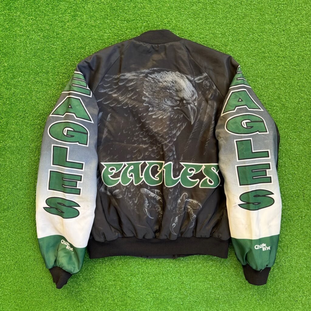 Out of stockChalkline90’s Philadelphia Eagles Chalkline Fanimation NFL Bomber Jacket Size Large Green Front$298Sizes: XL
